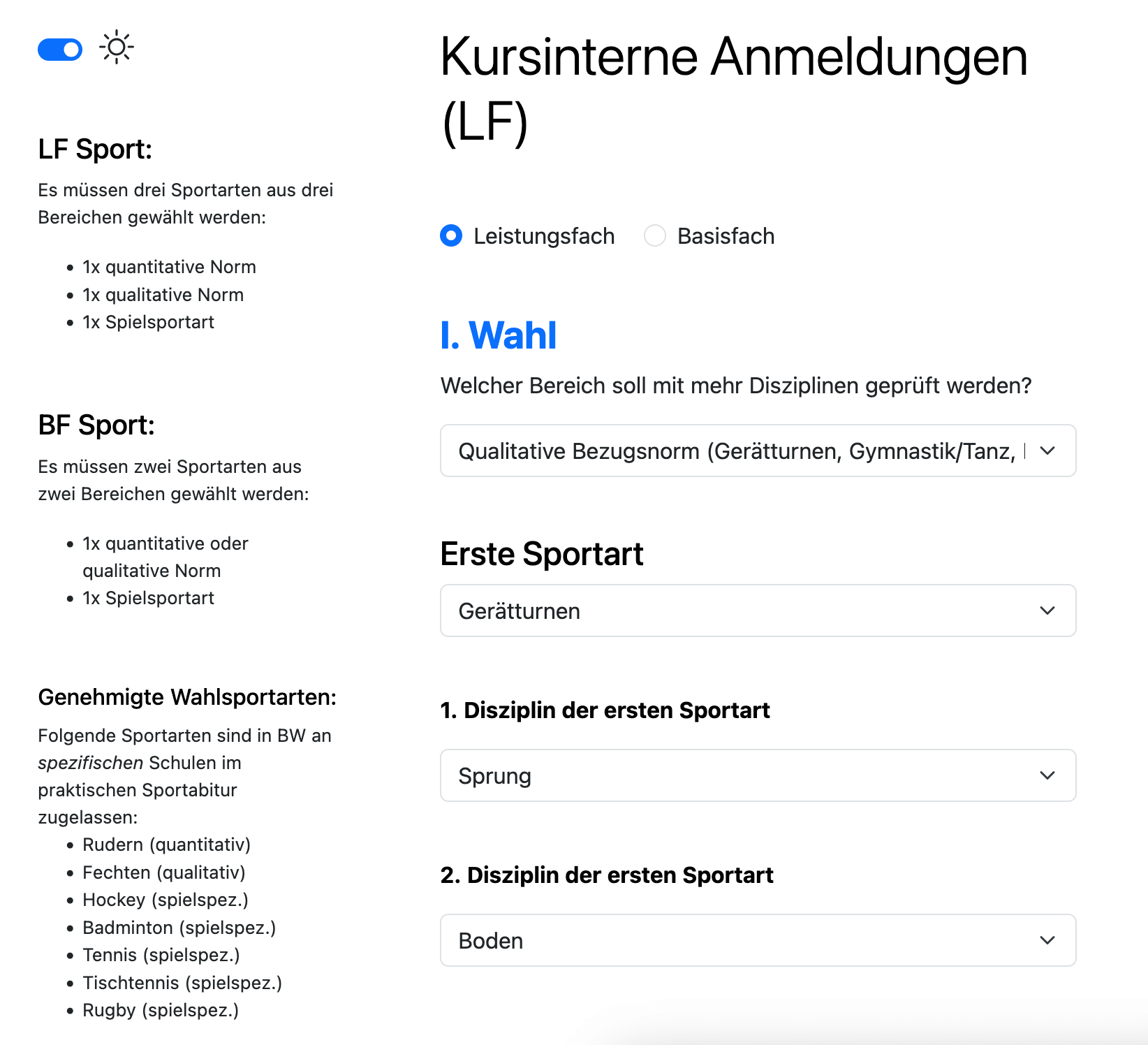 Basisfach (BF) und Leistungsfach (LF) Sport: Zunächst war die Anmeldung lediglich für das LF integriert. Die Anmeldungen für Teilnehmende des Basisfach ist hinzugekommen.