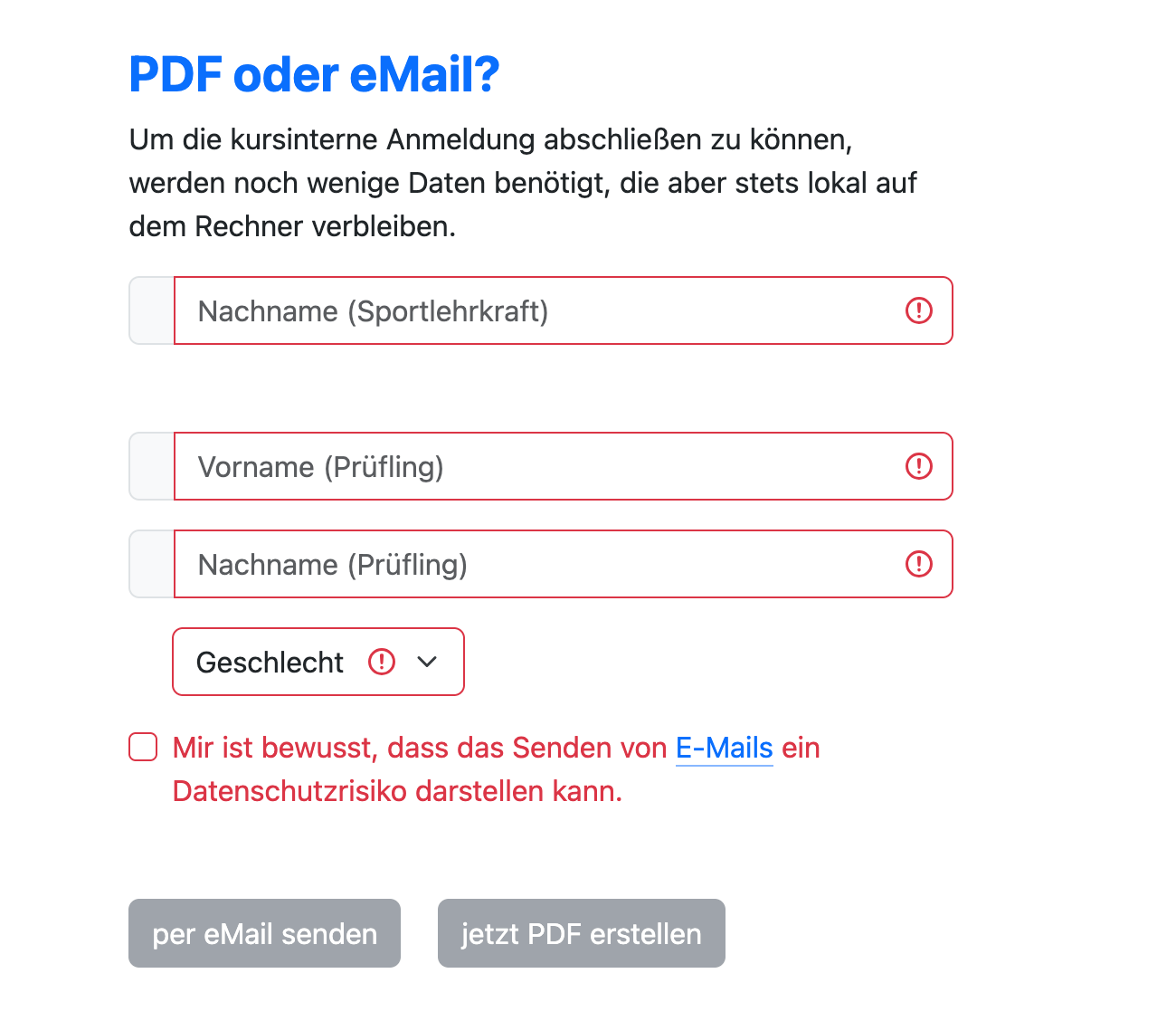 Eingabe und Generierung der PDF-Anmeldungsdatei ist im Browser möglich. Es werden keine externen Bibliotheken geladen. Die Daten bleiben im Browser. Bei der Auswahl, die Wahlen per E-Mail zu versenden, wird auf ein mögliches Datenschutzrisiko hingewiesen.